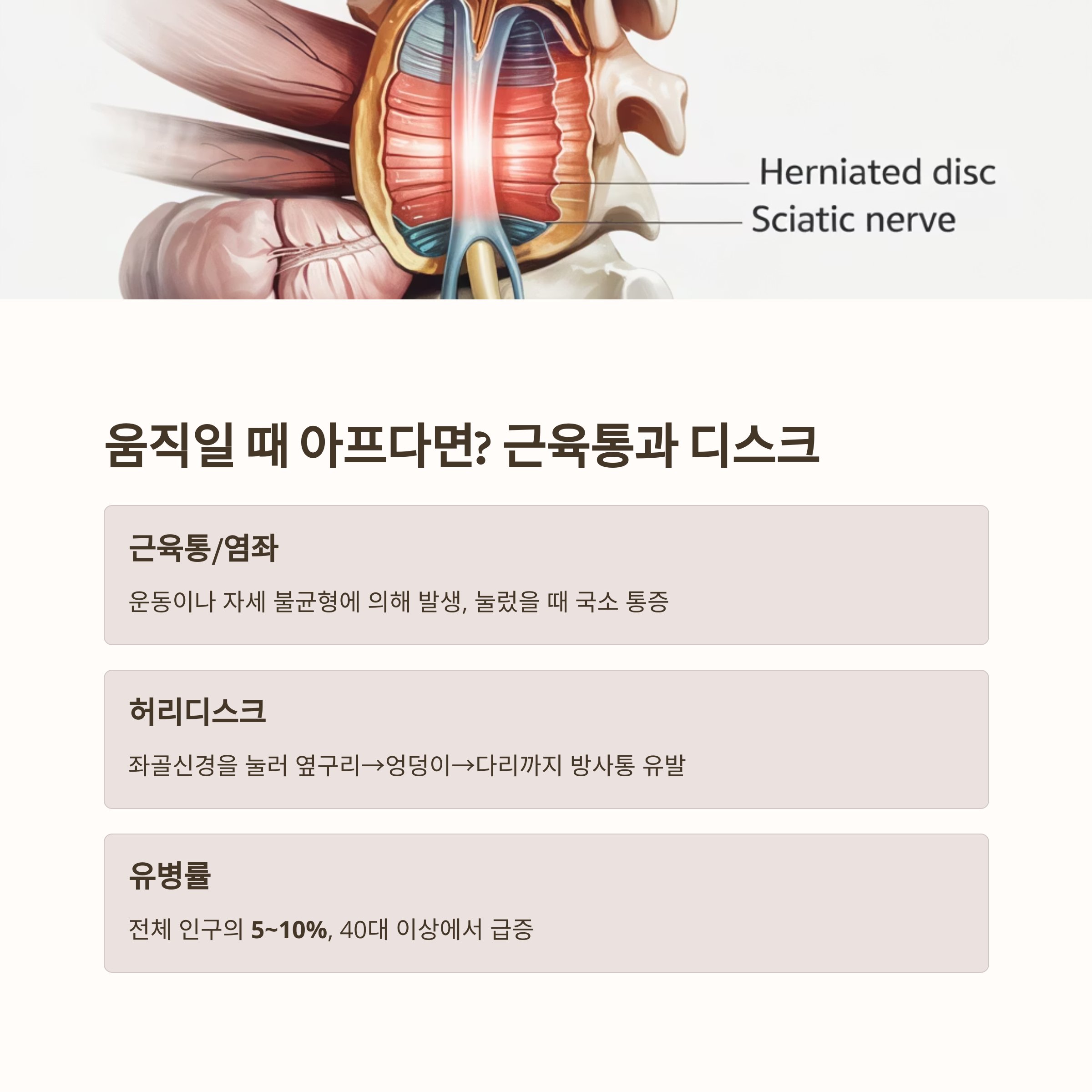 움직일 때 아프고 눌리면 더 아프다면? 근육통과 디스크 가능성