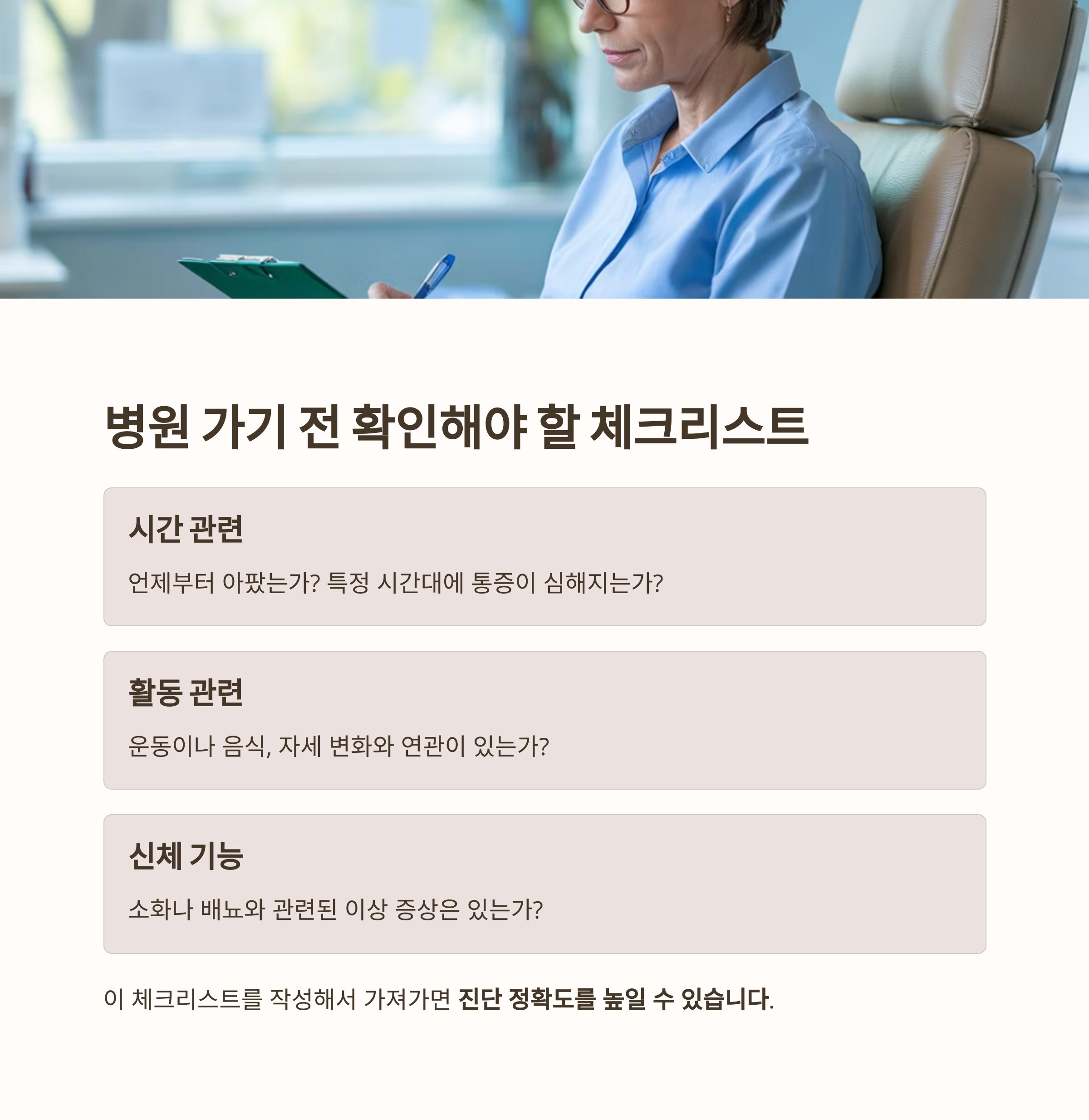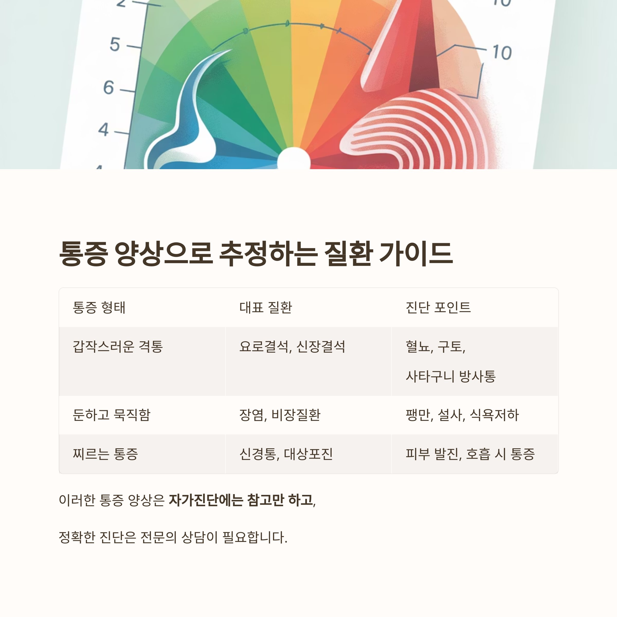 이러한 통증 양상은 자가진단에는 참고만 하고, 정확한 진단은 전문 검사와 상담이 필요합니다.