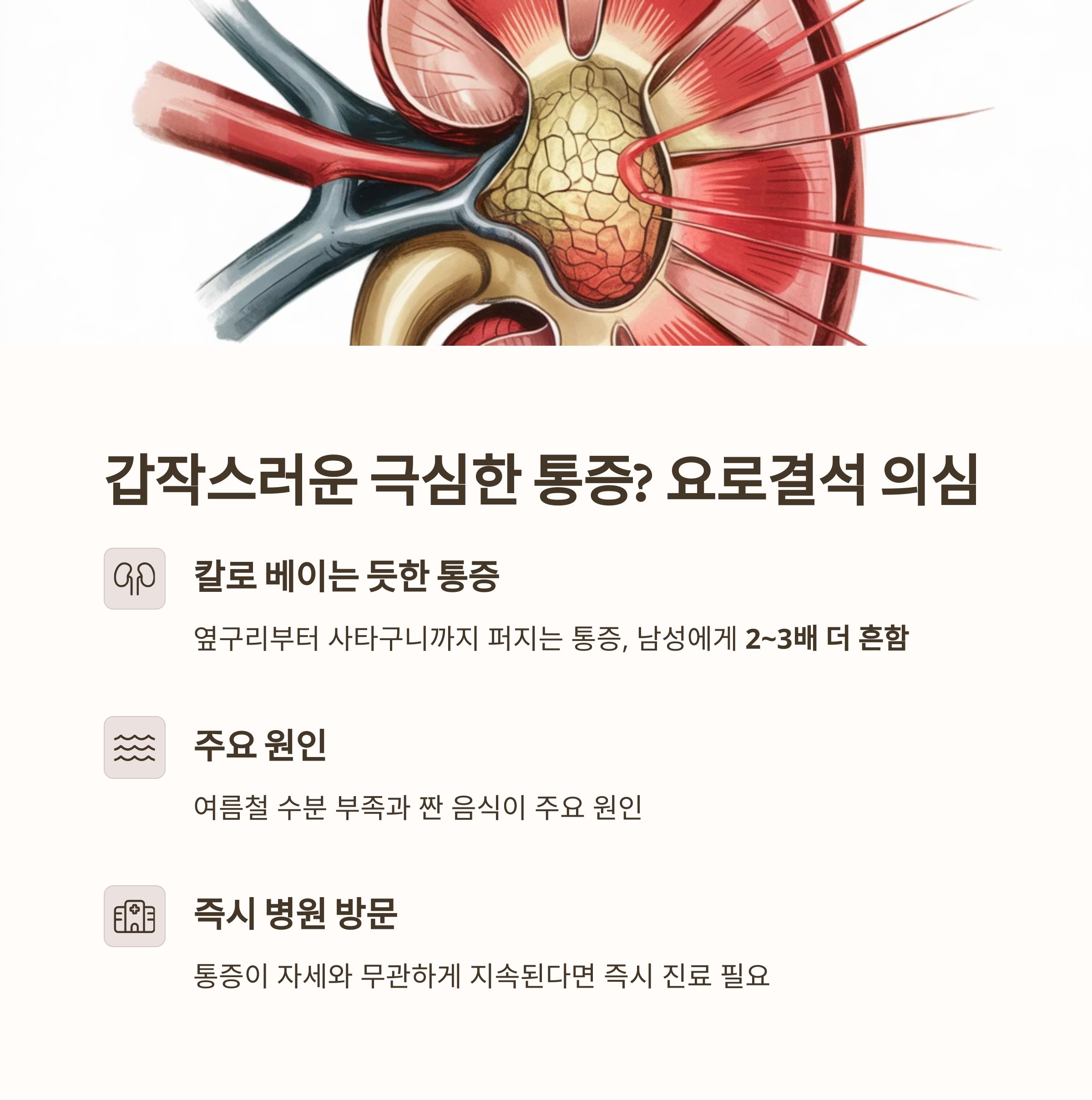 구토, 혈뇨, 발열, 빈뇨감이 동반되면 의심해야 합니다. - 여름철 수분 부족과 짠 음식이 주요 원인입니다.
