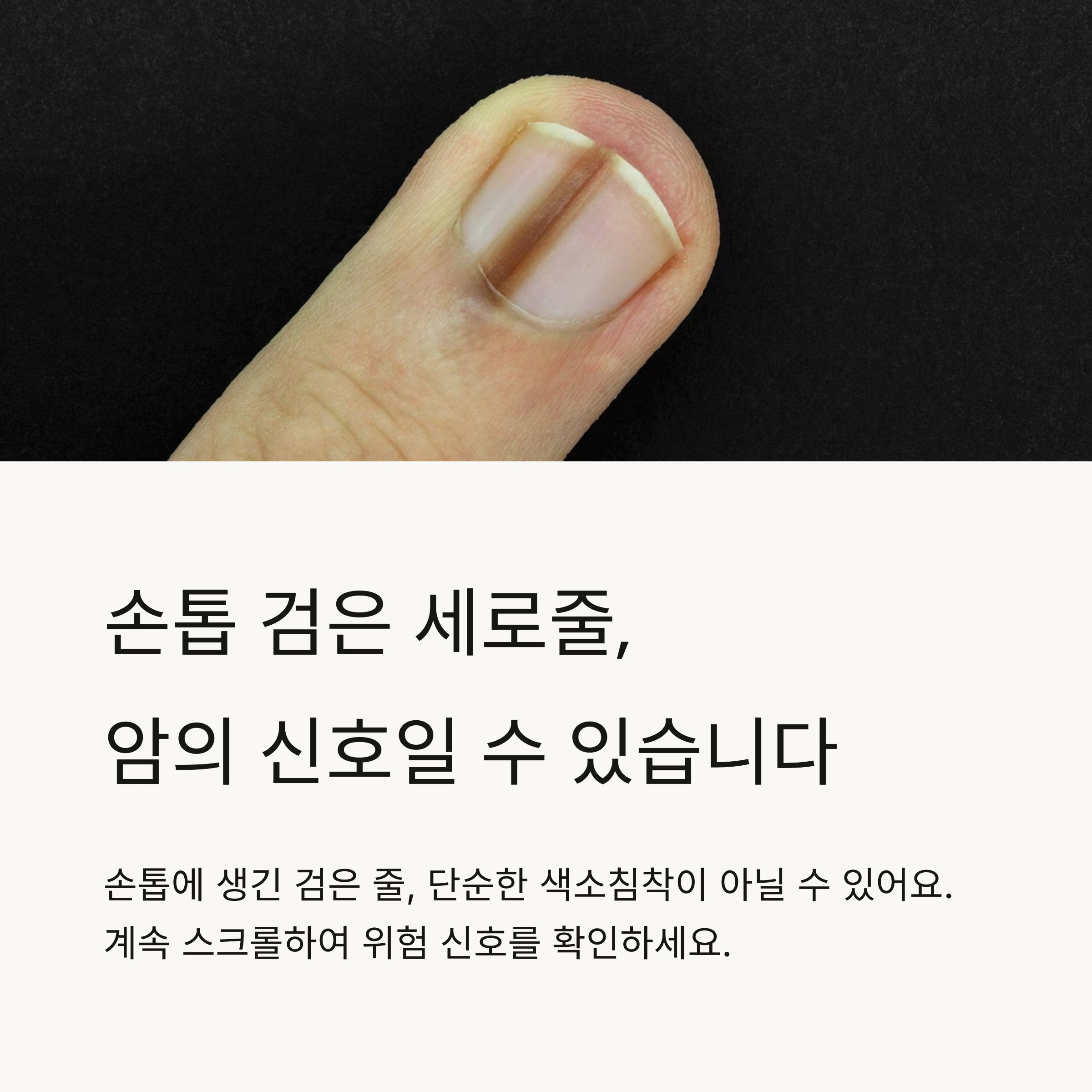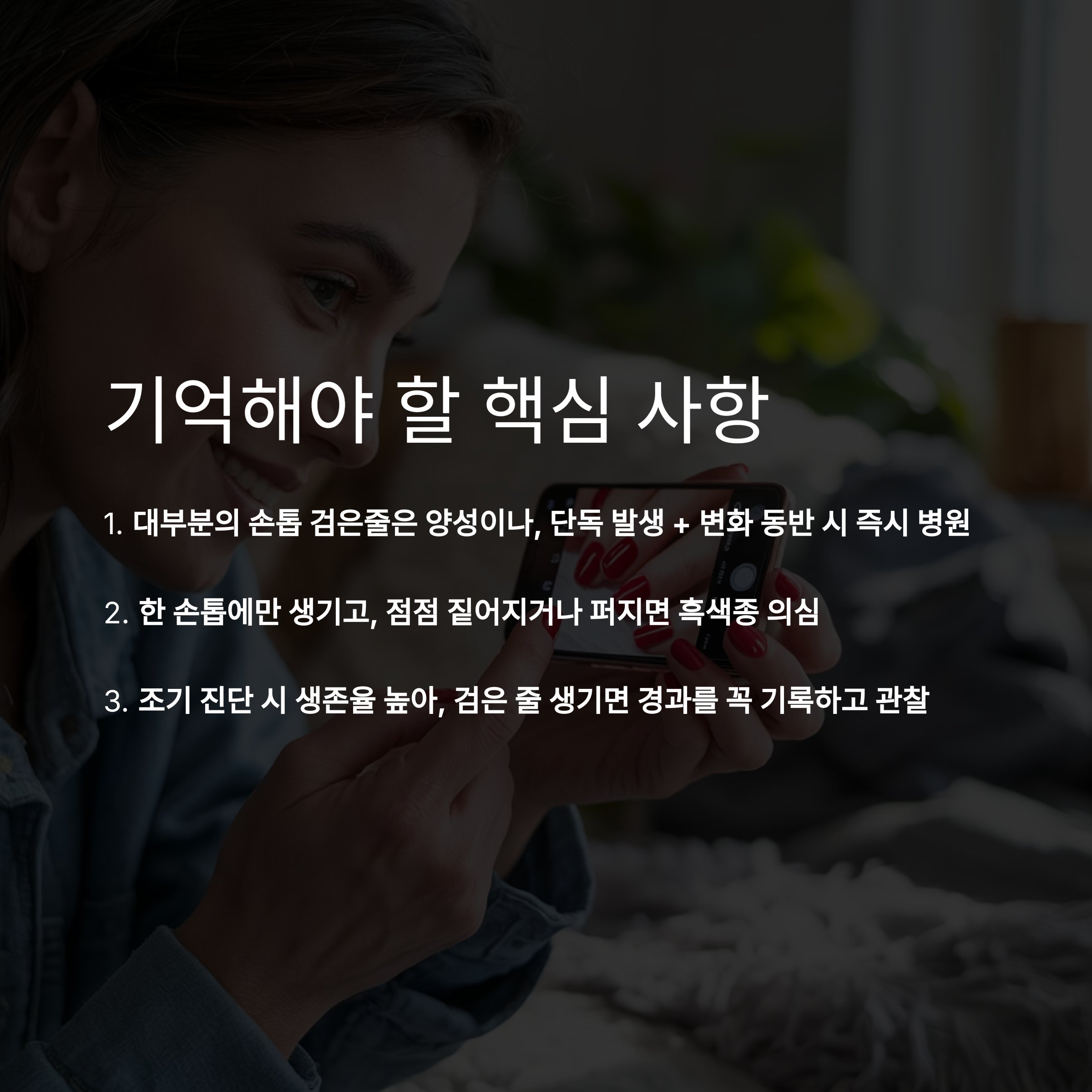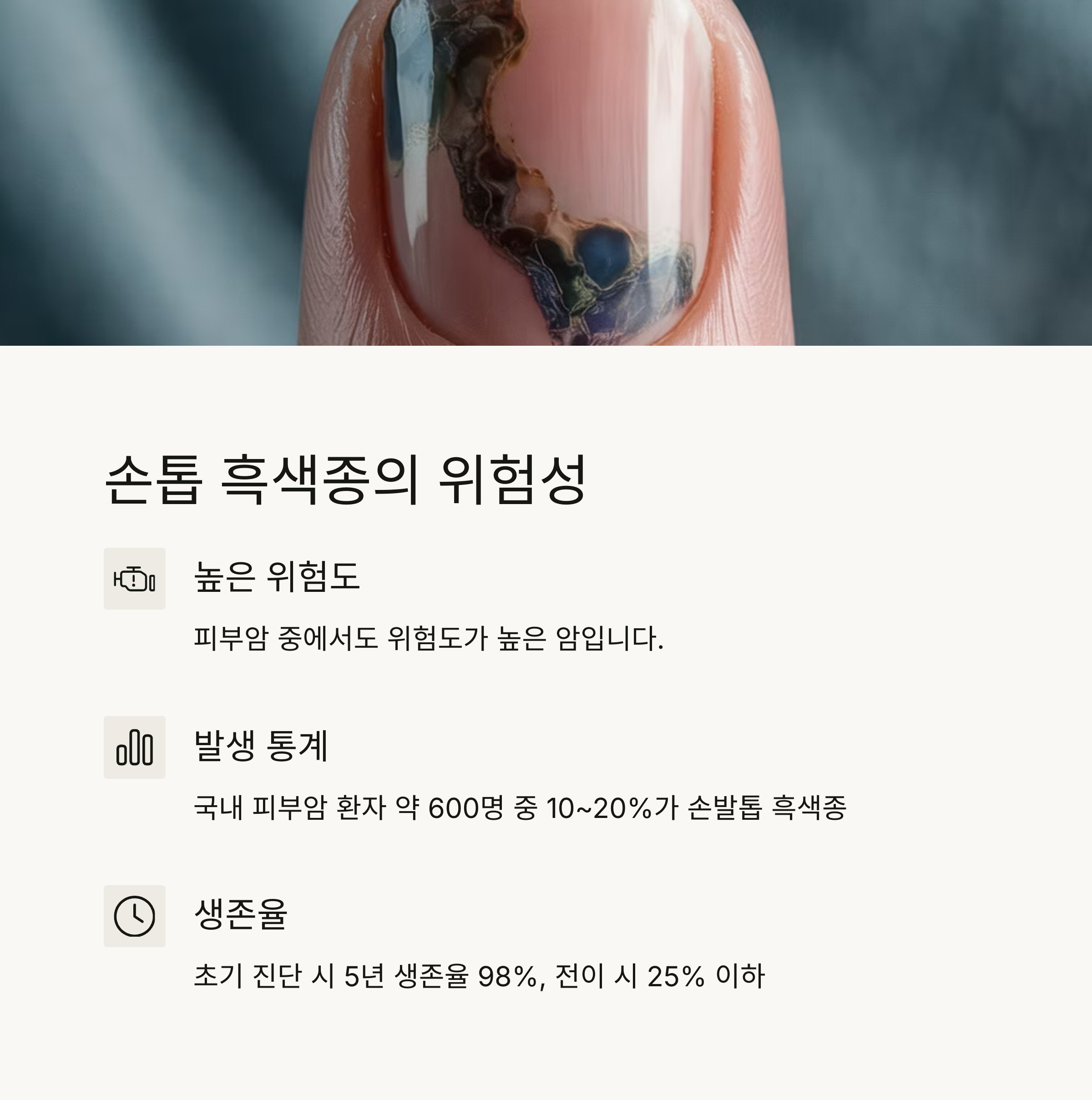 "손톱 흑색종(조갑하흑색종)은 피부암 중에서도 위험도가 높은 암"입니다.