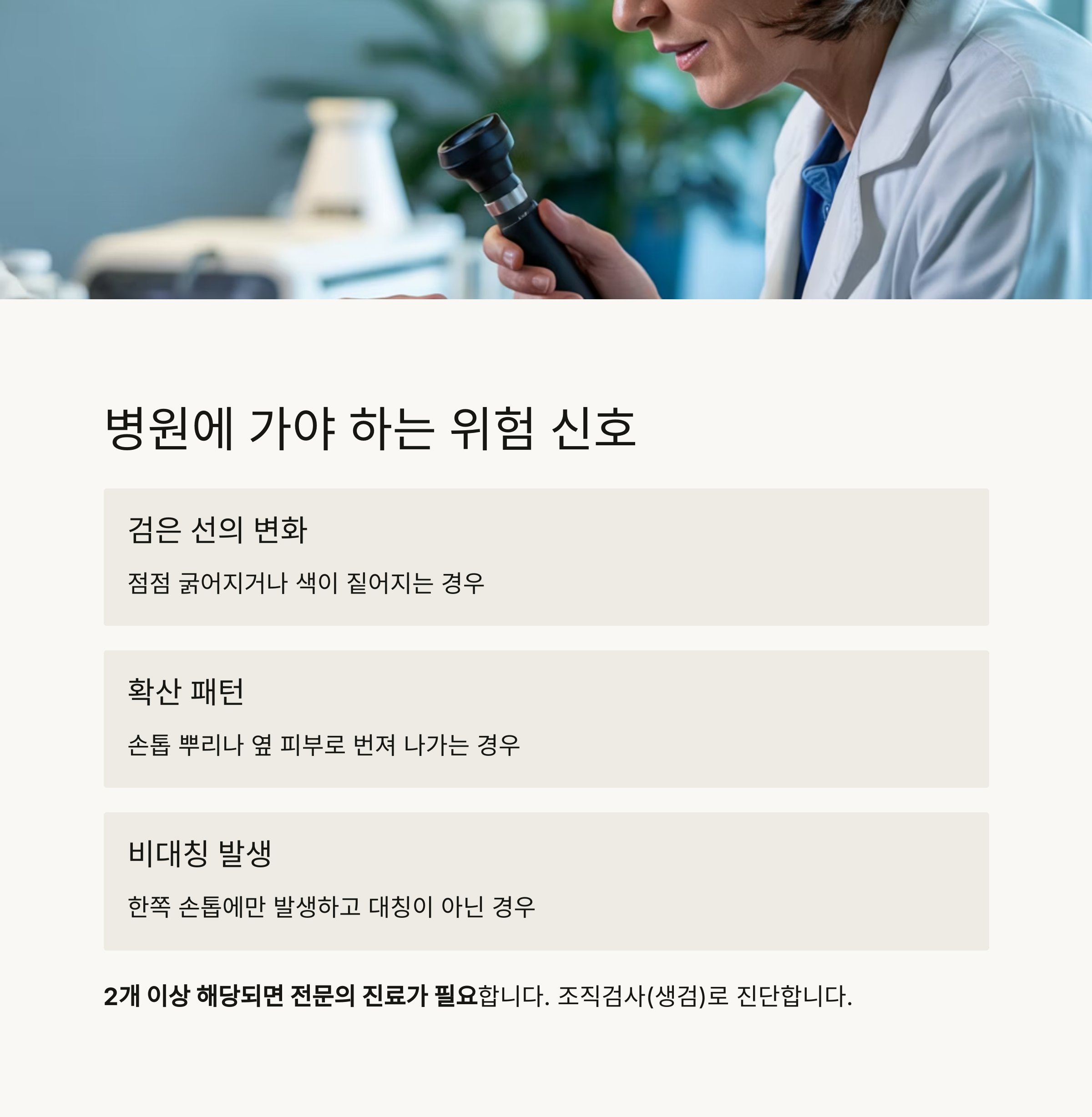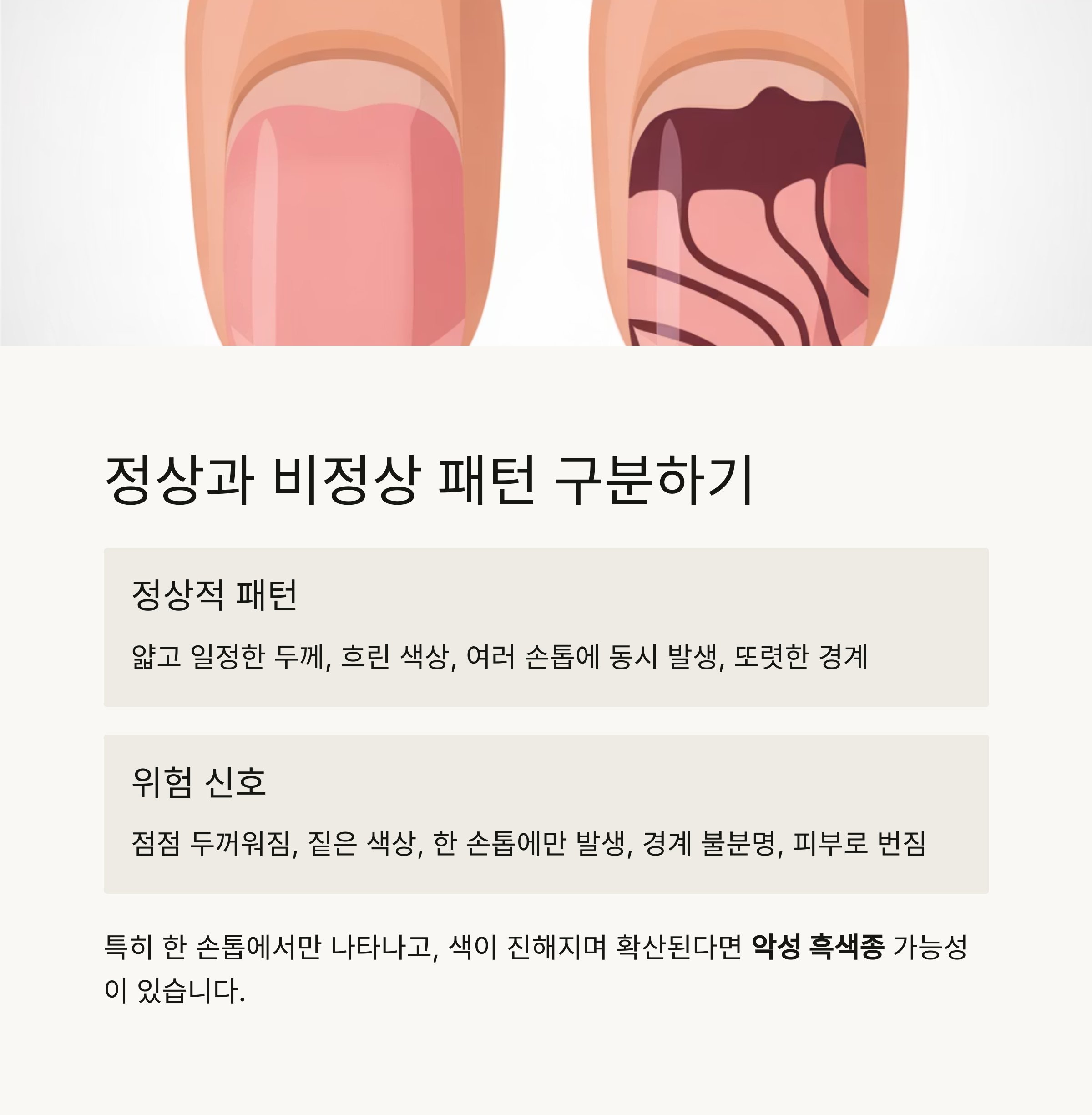 - 대부분의 손톱 검은줄은 양성이나, 단독 발생 + 변화 동반 시 즉시 병원