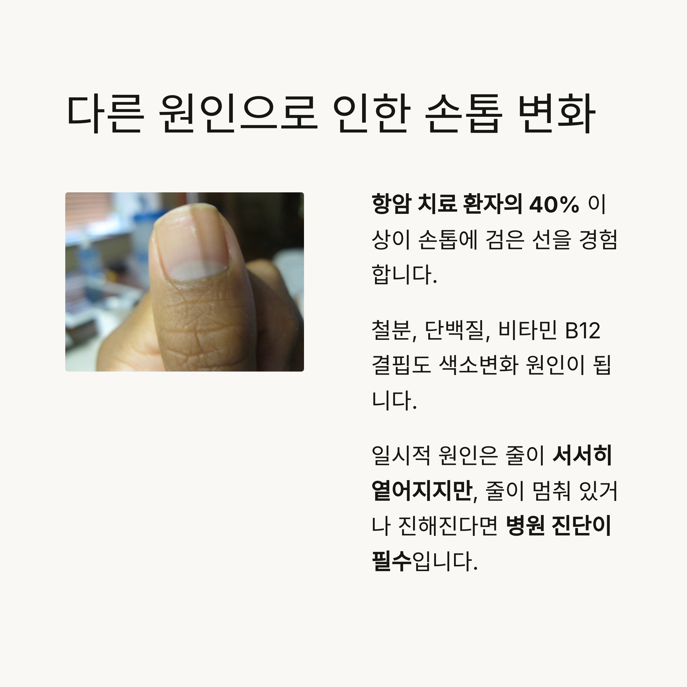 - 철분 부족, 단백질 결핍, 비타민 B12 결핍 등도 색소변화 원인이 될 수 있습니다.
