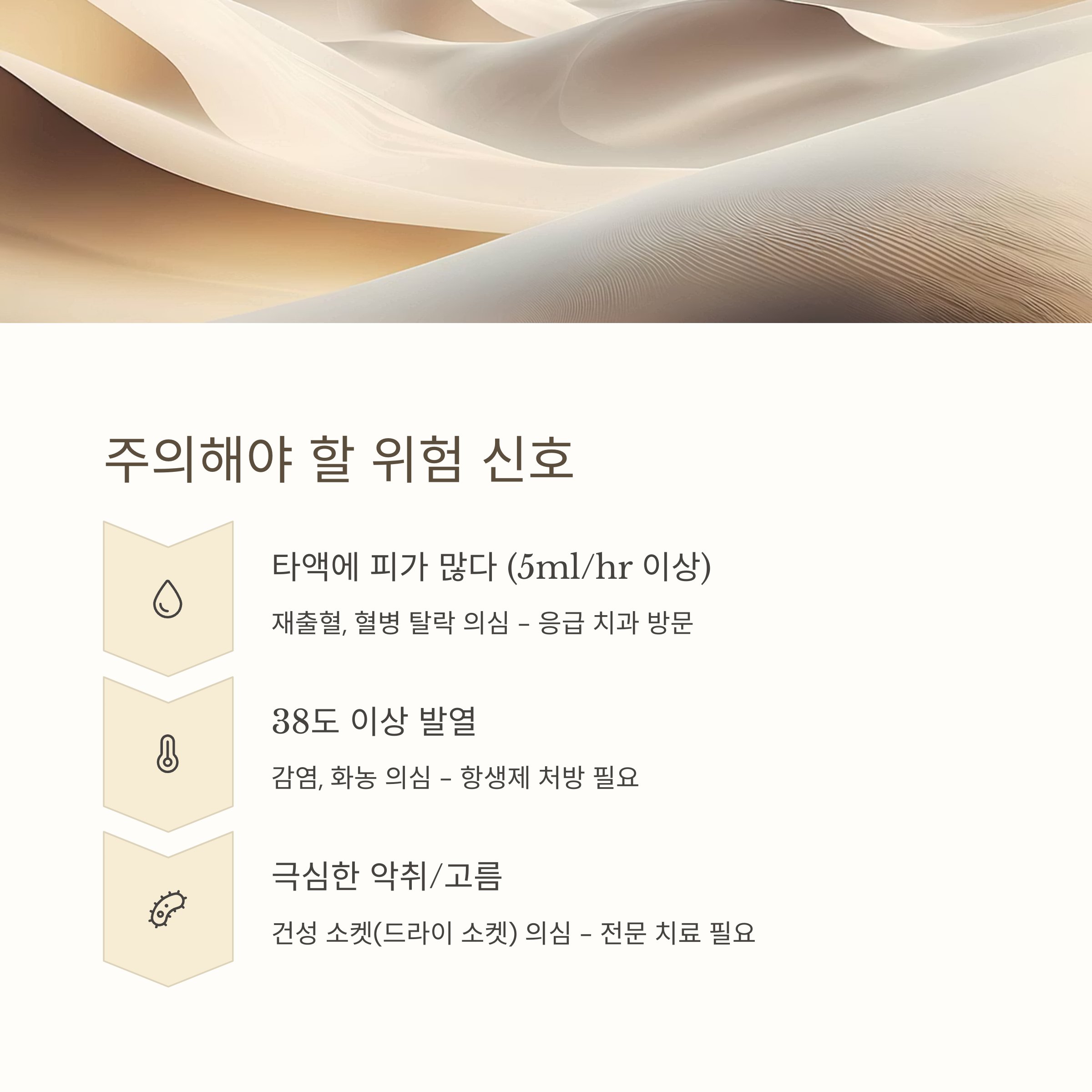 | 극심한 악취/고름 | 건성 소켓(드라이 소켓) | 전문 치료 필요 |