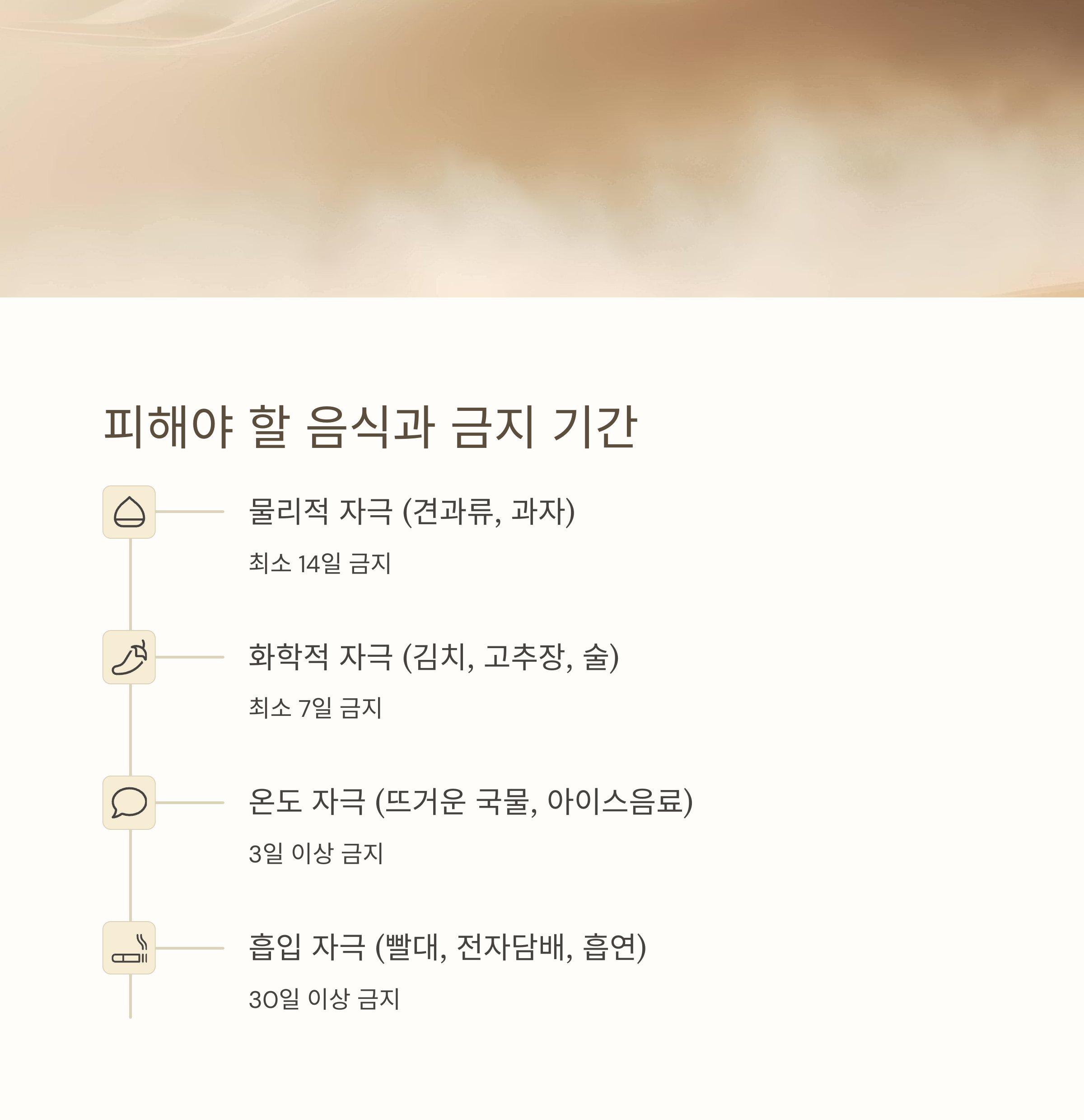 음식 선택에 있어 가장 중요한 것은 상처에 자극을 주지 않는 것입니다. 아래 표를 통해 금지 기간과 구체적인 예시를 확인하세요.