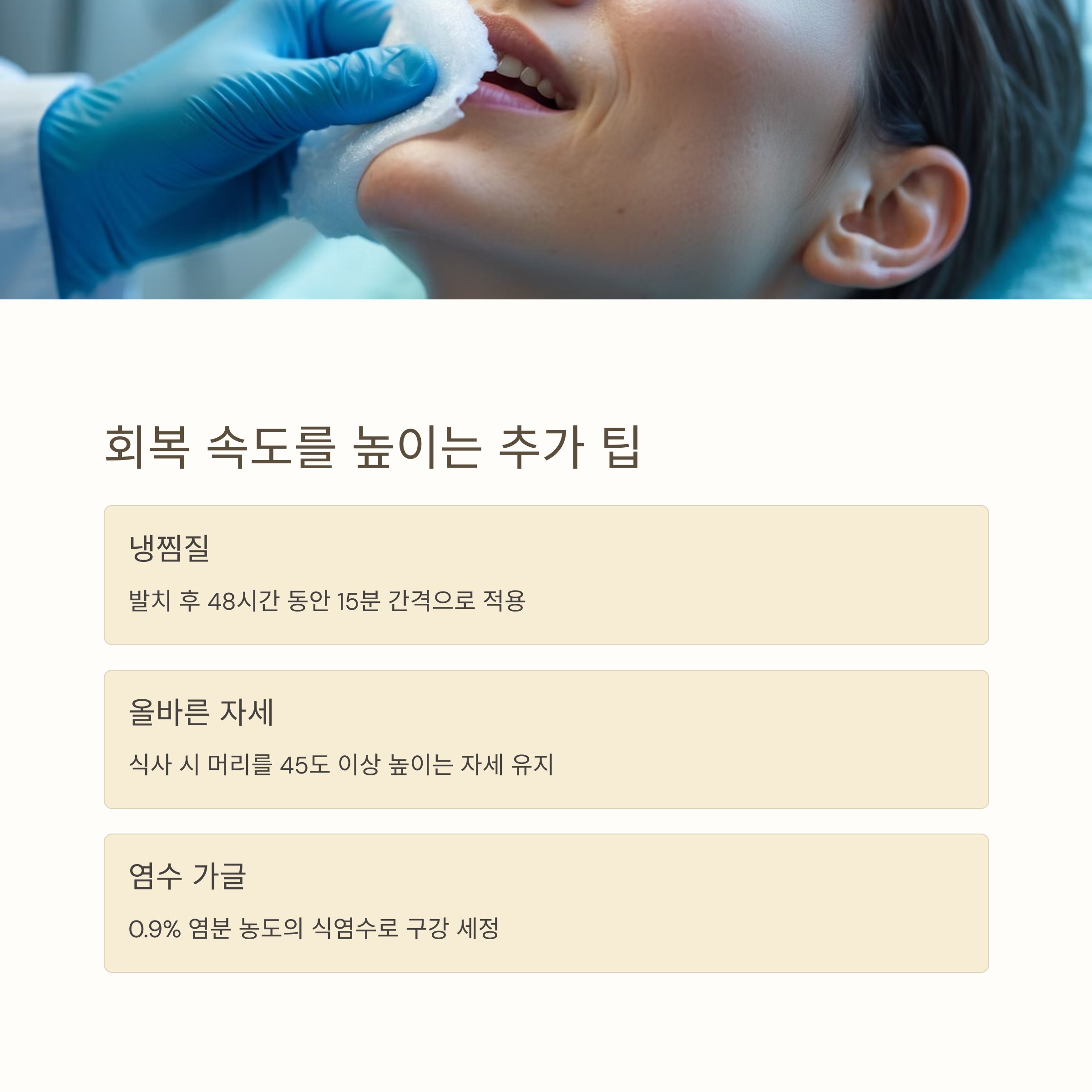 냉찜질은 발치 후 48시간 동안 15분 간격으로 적용해야 부기와 통증을 줄일 수 있습니다. 또한 식사 시에는 머리를 45도 이상 높이는 자세가 출혈을 방지합니다.