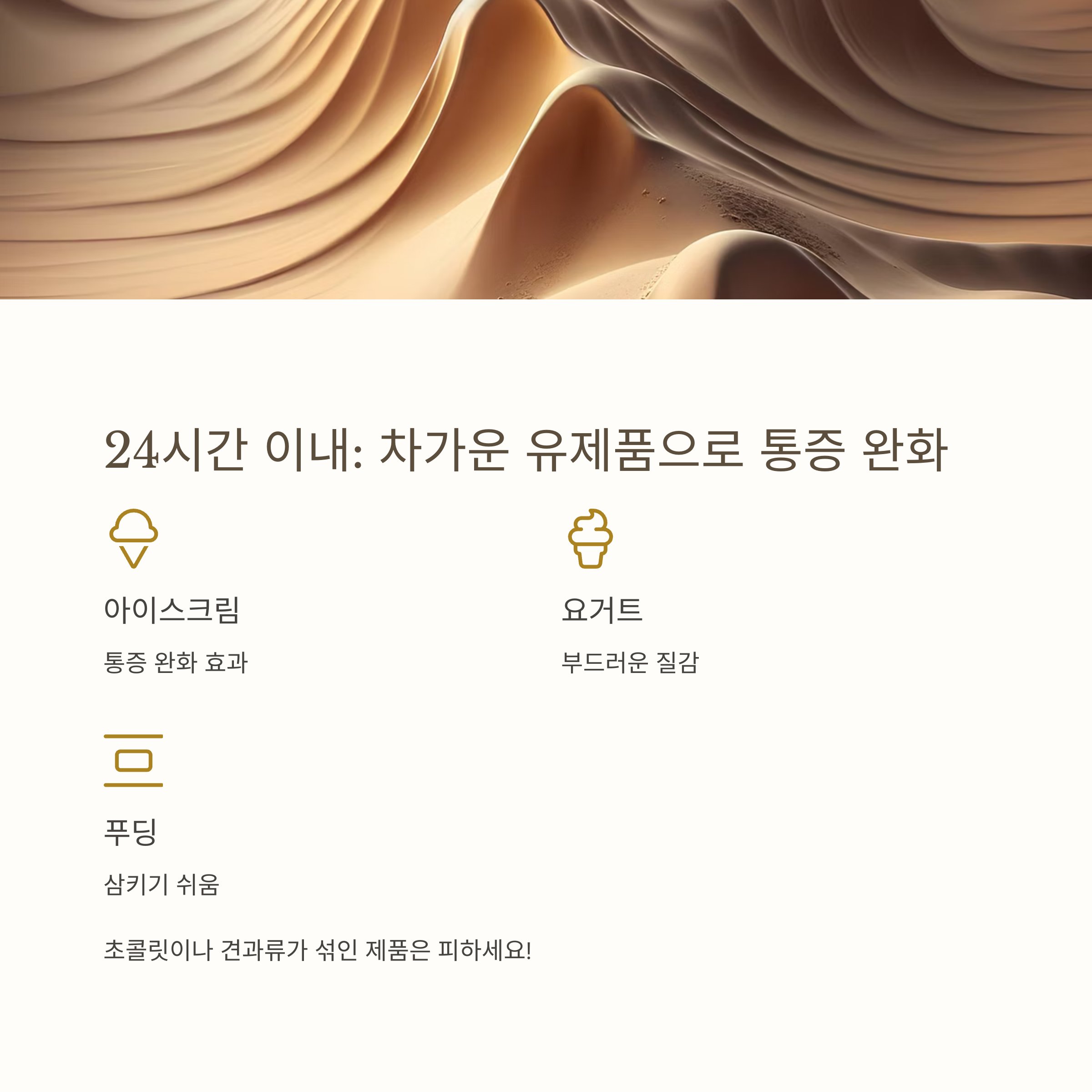 초기 24시간 동안은 조직 부기와 통증이 두드러지기 때문에, 차갑고 부드러운 유제품 위주 식단이 권장됩니다. 아이스크림, 요거트, 푸딩 등이 대표적이며, 통증 완화 효과와 삼키기 쉬운 질감이 회복에 도움을 줍니다.