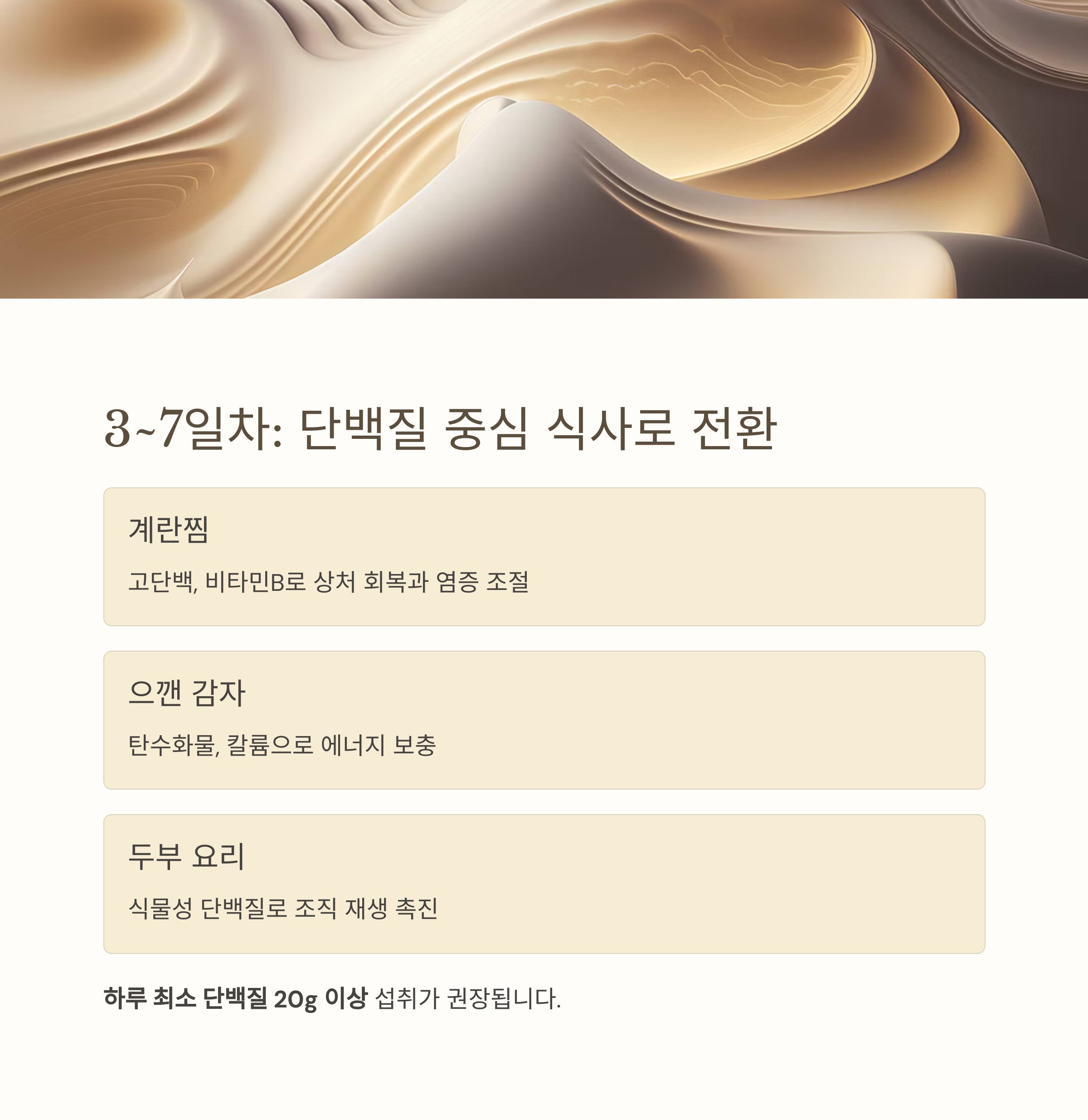 특히 초반 3일과 단백질 집중 섭취기인 3~7일차는 회복 속도를 좌우하는 핵심 구간입니다.