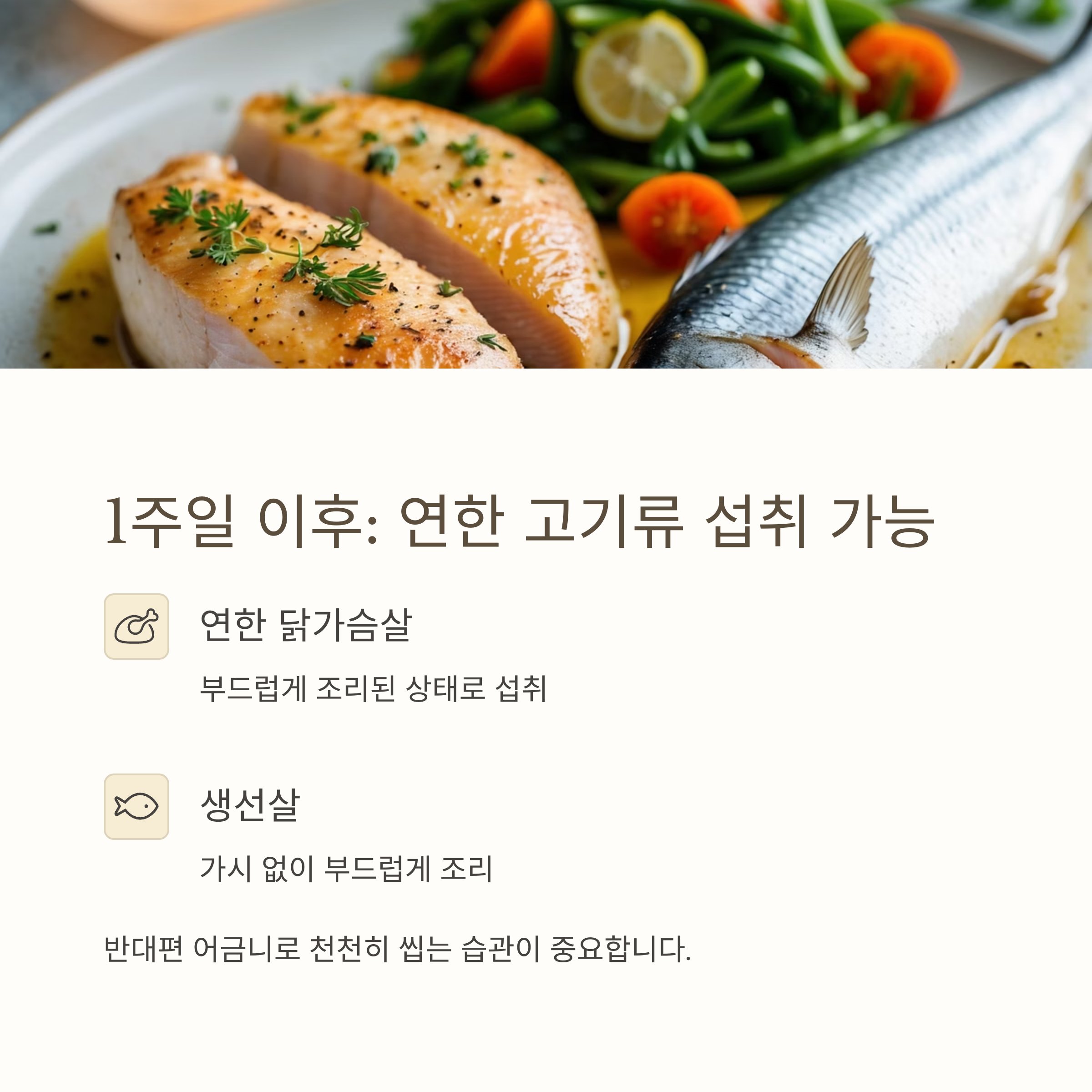 1주일 이후, 점진적으로 연한 고기류 섭취 가능
