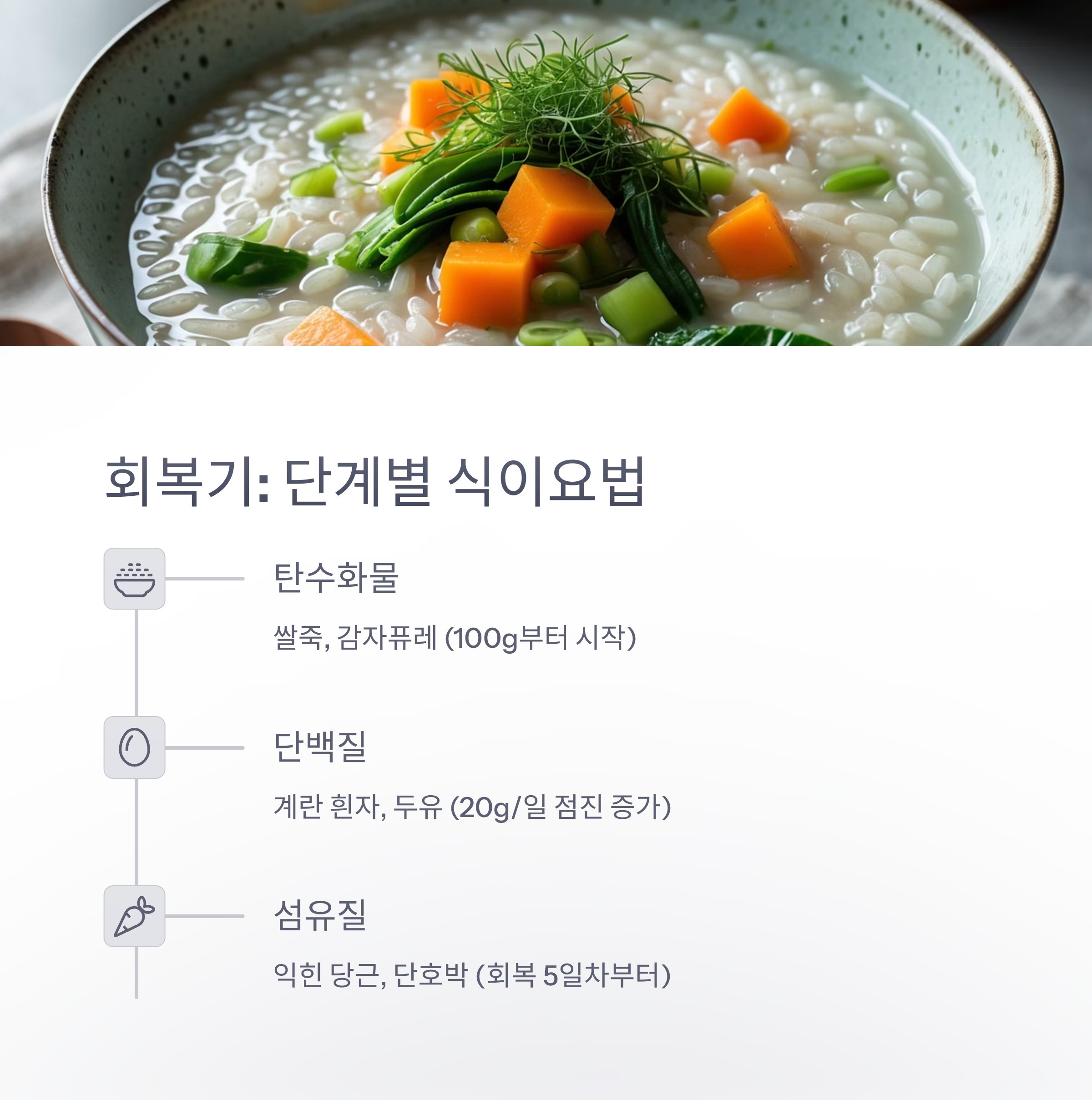 회복기(48시간 이후)에는 장점막 재생과 에너지 보충을 위한 식사 재개가 필요합니다.