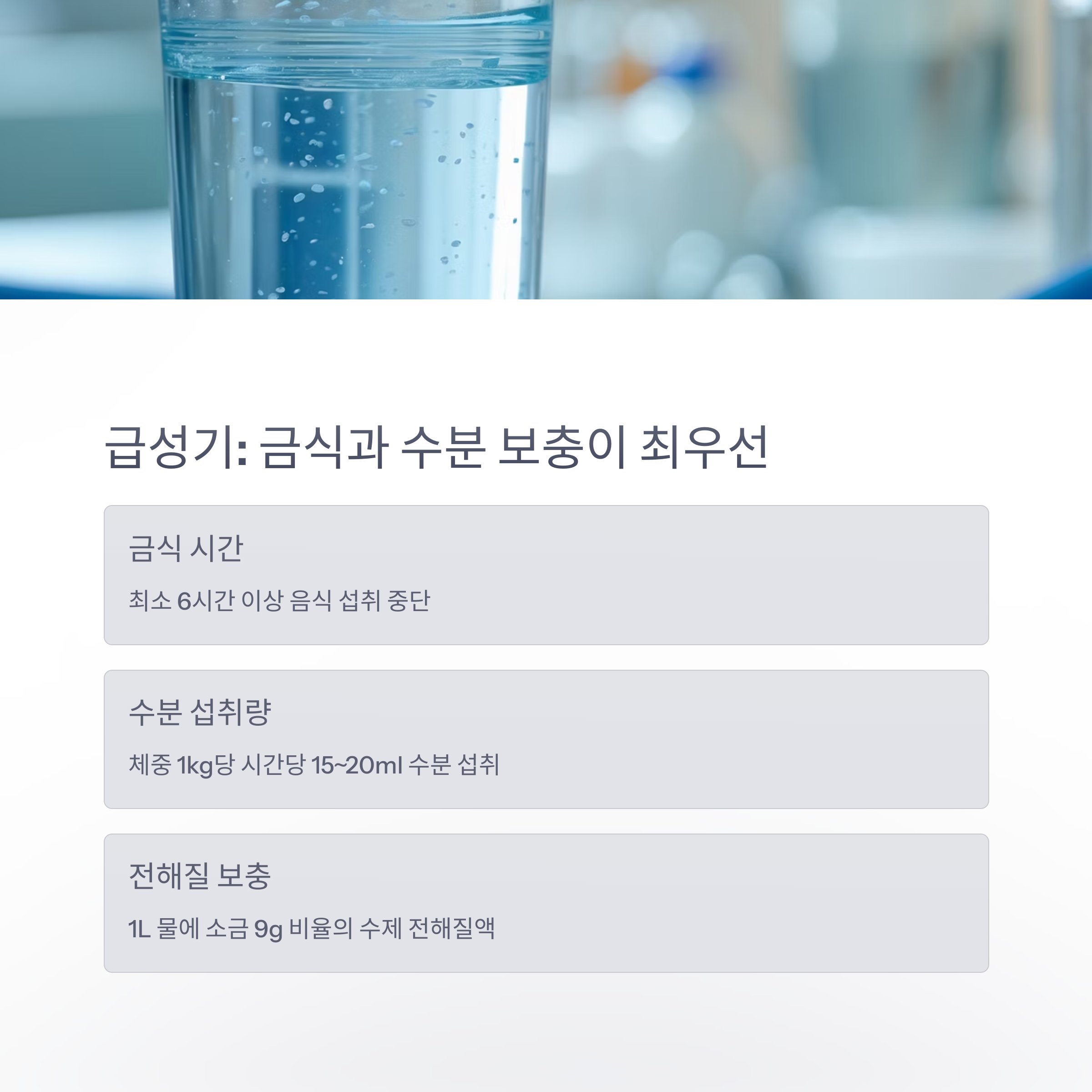 이 시기에는 수분과 전해질 보충이 생명선이며, 이온음료나 끓인 보리차를 시간당 체중 1kg당 15~20ml 비율로 마시는 것이 권장됩니다.