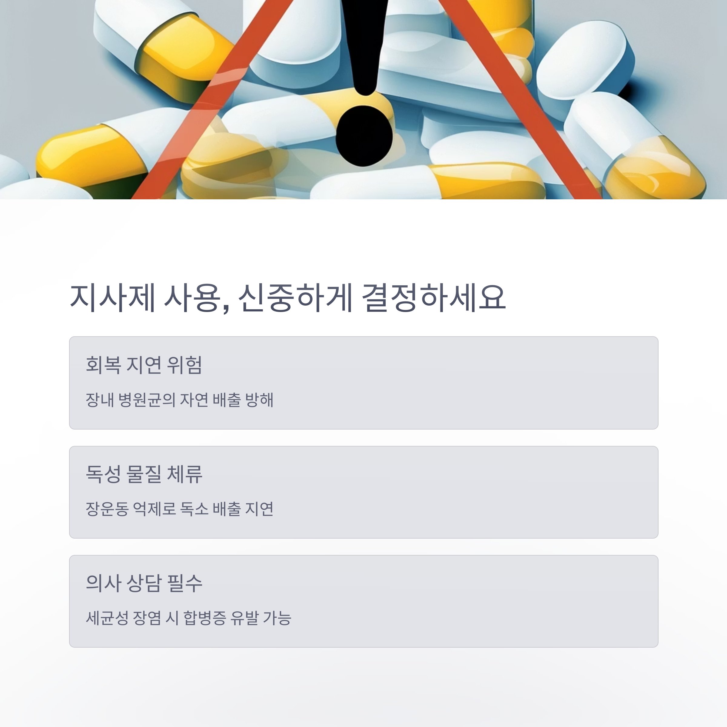 전문의들은 "지사제는 장운동을 억제해 오히려 독성 물질의 체류 시간을 늘릴 수 있다"고 경고합니다.