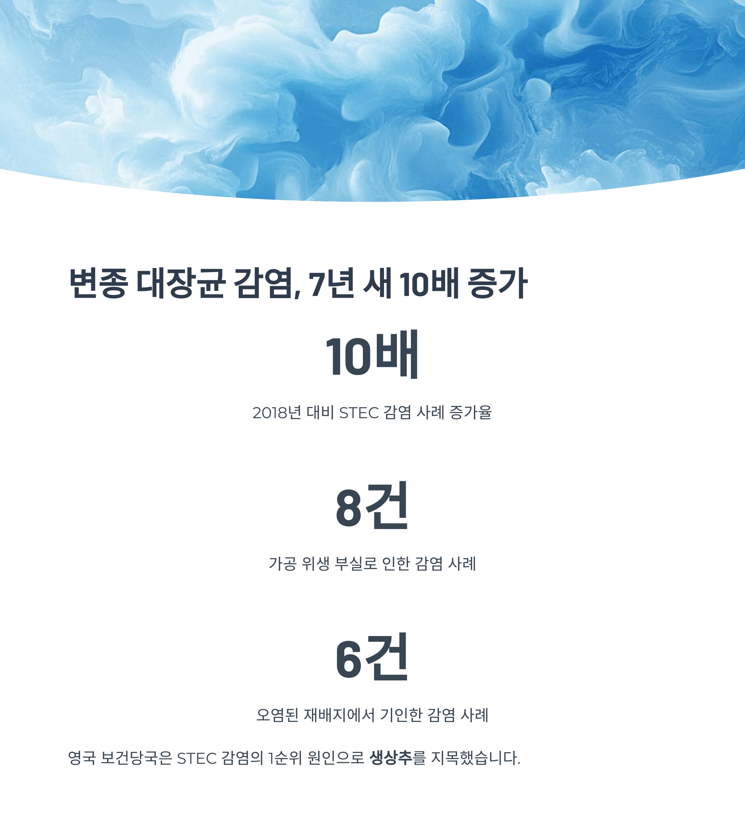 2025년 기준 영국 보건당국은 STEC 감염 사례가 2018년 대비 10배 이상 증가했으며, 그 원인 중 1순위로 생상추를 지목했습니다. 특히 50세 미만 환자 비중이 급증하며 젊은 대장암 유병률과의 연관성이 분석되고 있습니다.
