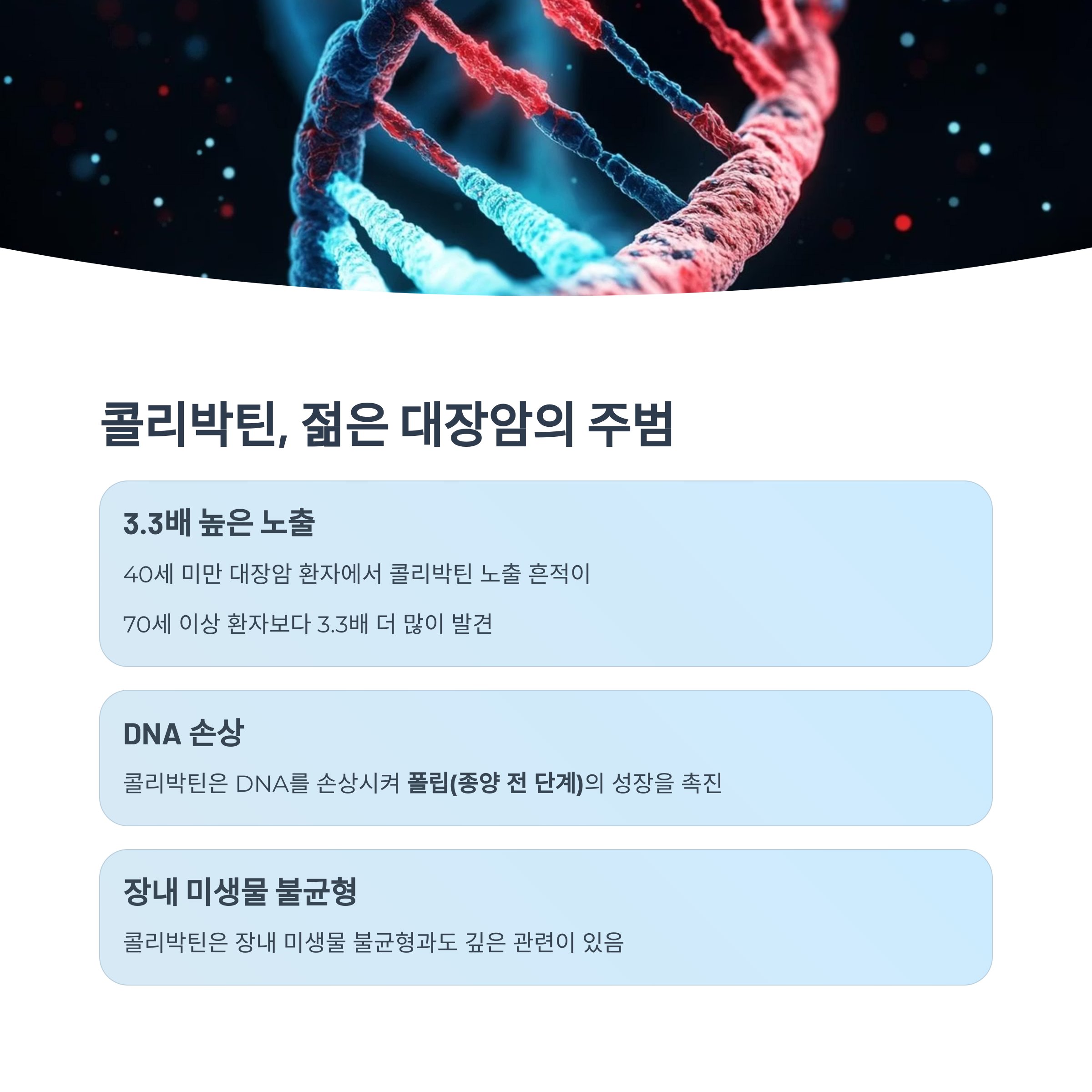 콜리박틴은 DNA를 손상시켜 **폴립(종양 전 단계)**의 성장을 촉진하며, 장내 미생물 불균형과도 깊은 관련이 있습니다.