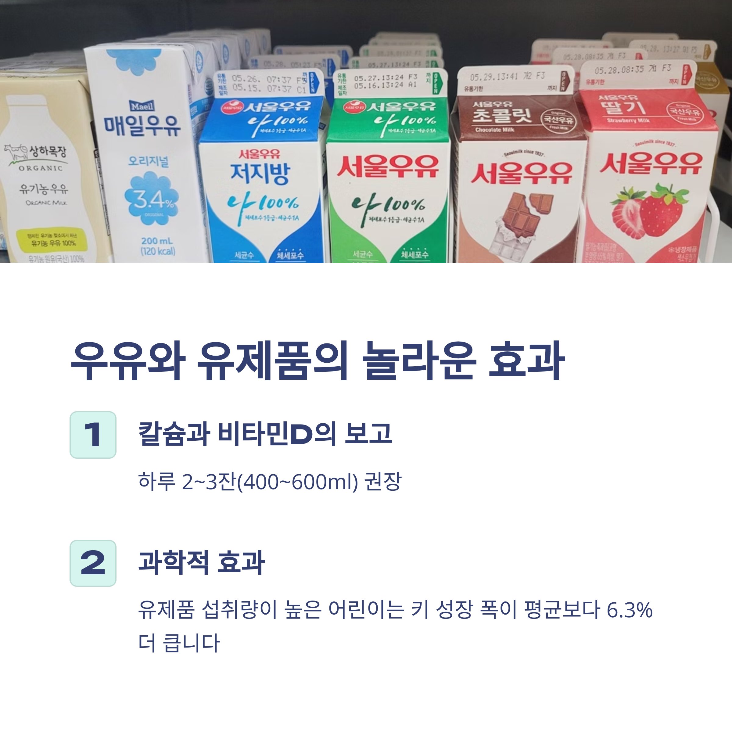 유제품 섭취량이 높은 어린이는 키 성장 폭이 평균보다 6.3% 더 큽니다.